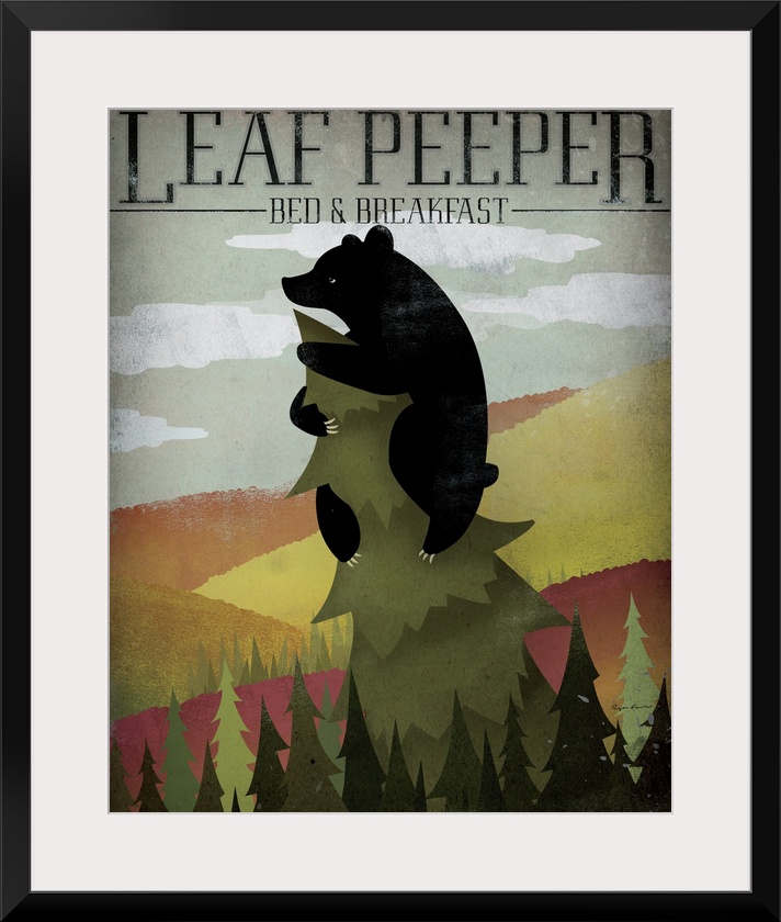 <p>Portrait artwork on a large canvas of a black bear hanging onto the top of a tall pine tree, on a background of autumn colored hills and smaller trees below. Text at the top reads "Leaf Peeper Bed & Breakfast".</p>