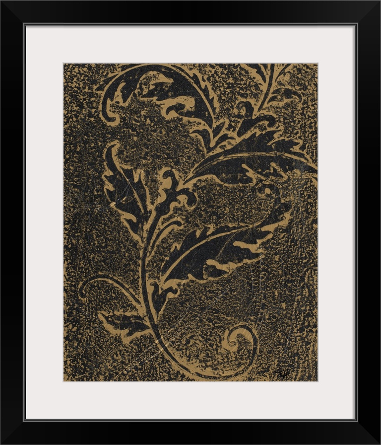 <p>Black and gold textured painting of a leaf silhouette.</p>