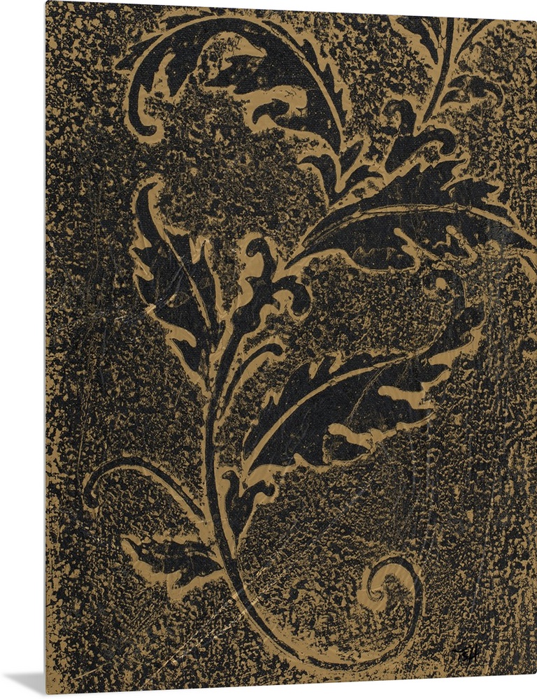 <p>Black and gold textured painting of a leaf silhouette.</p>
