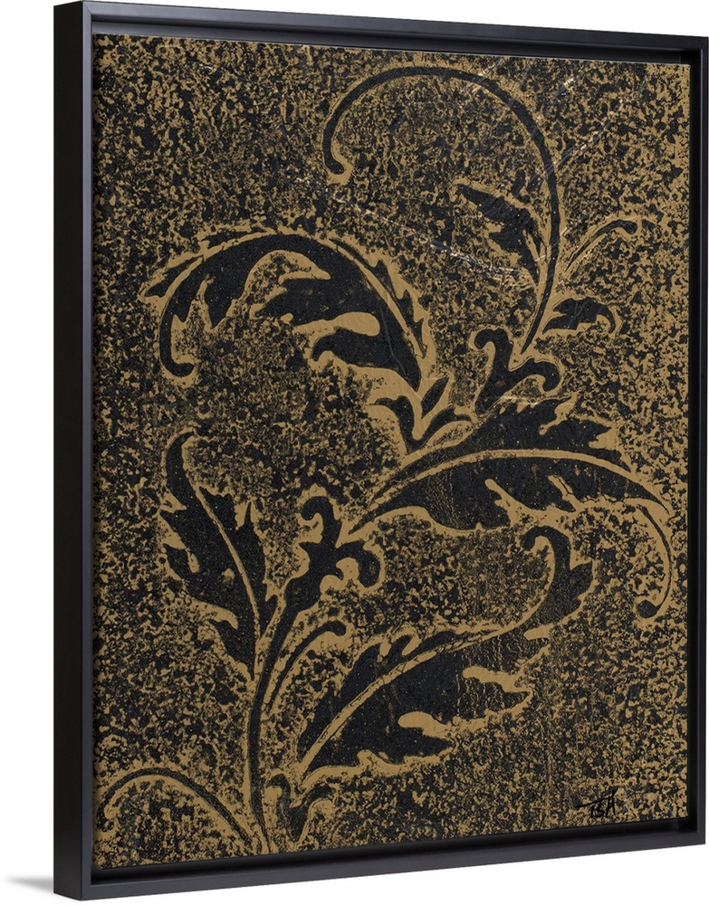 <p>Black and gold textured painting of a leaf silhouette.</p>