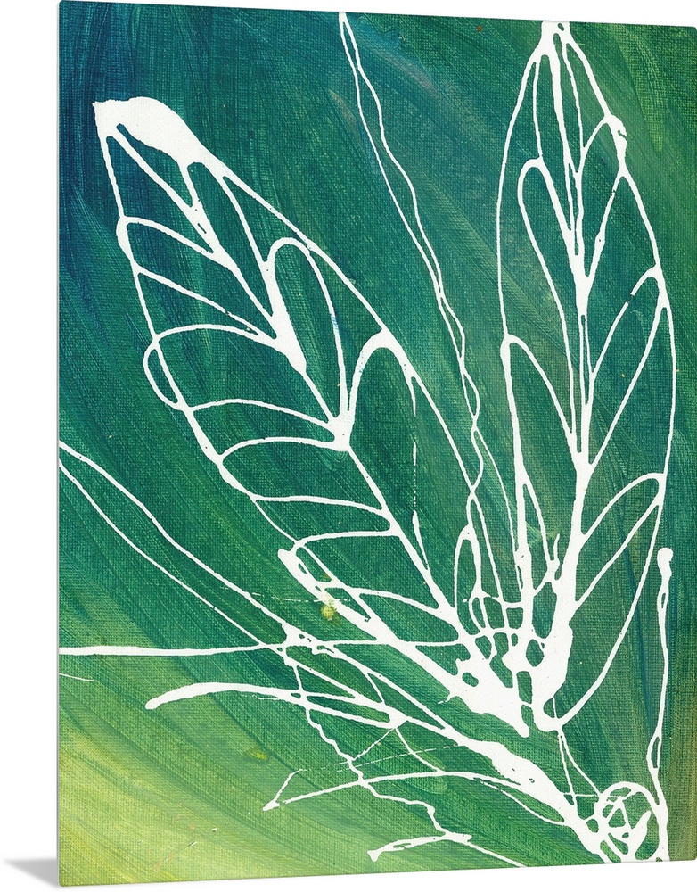 <p>Contemporary artwork of leaf shapes drawn in white paint over green tones.</p>