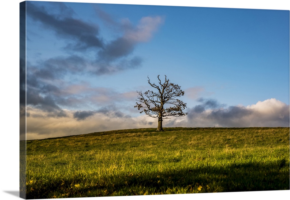 <p>Leafless tree in a grass field with clouds on the horizon, North Downs Way; Kent, England</p>