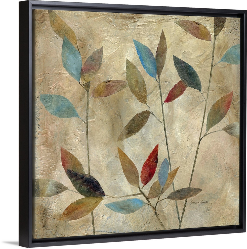 <p>Painting of thin branches with different colored leaves in muted colors.</p>