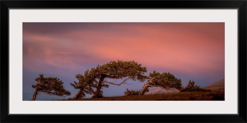 <p>Landscape photograph of leaning trees under a pink and blue sky.</p>