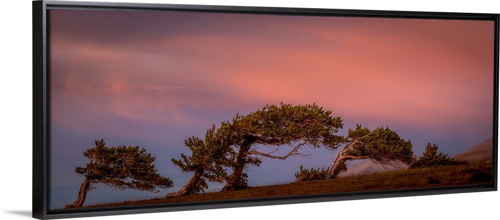 <p>Landscape photograph of leaning trees under a pink and blue sky.</p>