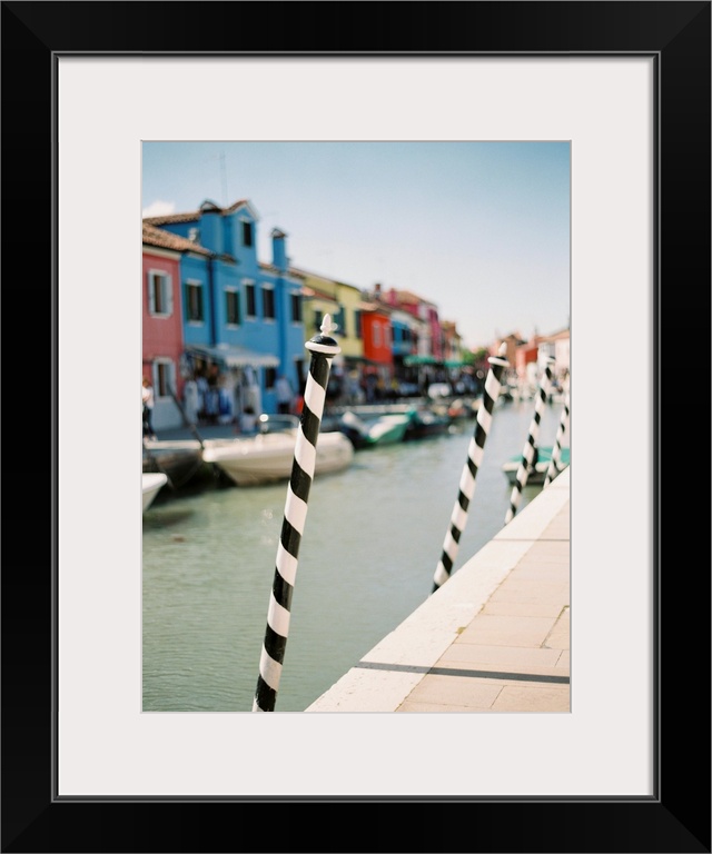 <p>Photograph of the black and white poles used for mooring gondolas, Venice, Italy.</p>