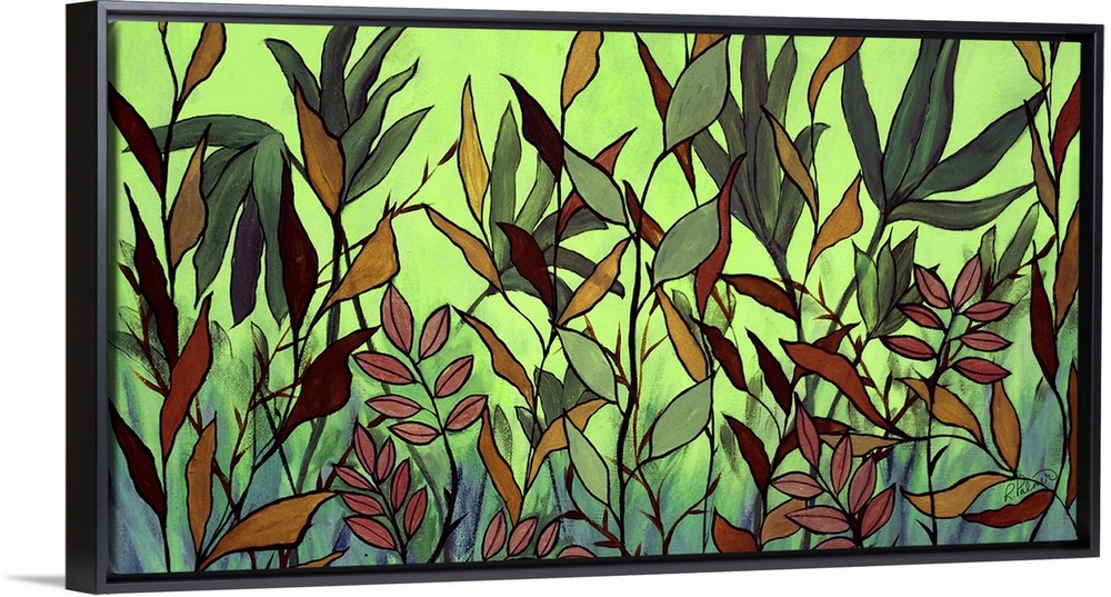 <p>A contemporary painting of a ground level view of tall grass against a green background.</p>