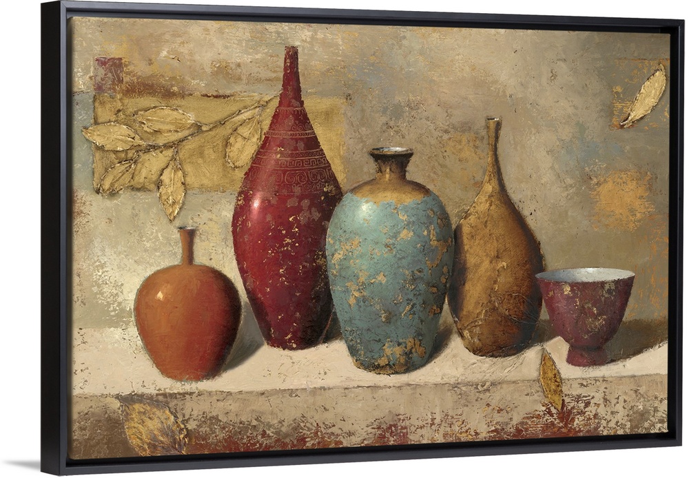 <p>Decorative artwork for the home of different size vases sitting on a stone ledge with golden leaves painted around them.</p>
