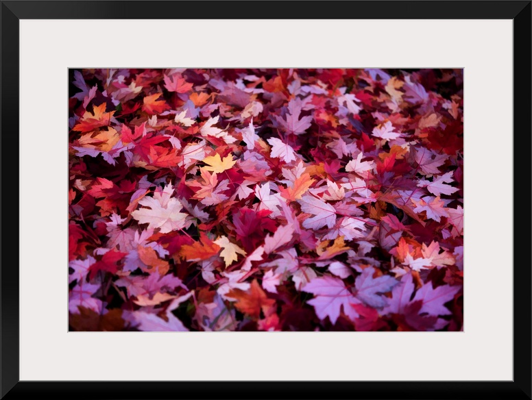 <p>Forest floor covered in purple and red leaves in the fall.</p>