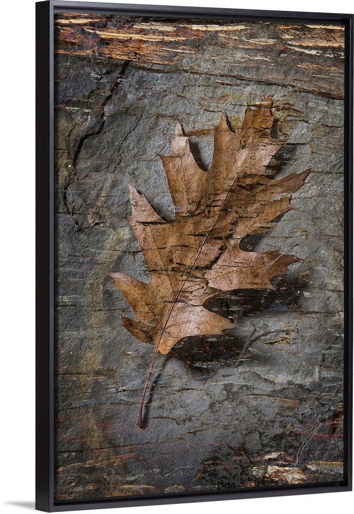 <p>Still life of a leaf with bark like texture superimposed over top.</p>