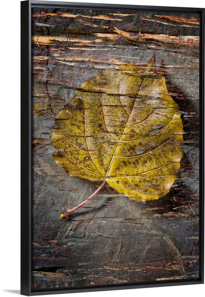 <p>Still life of a leaf with bark like texture superimposed over top.</p>
