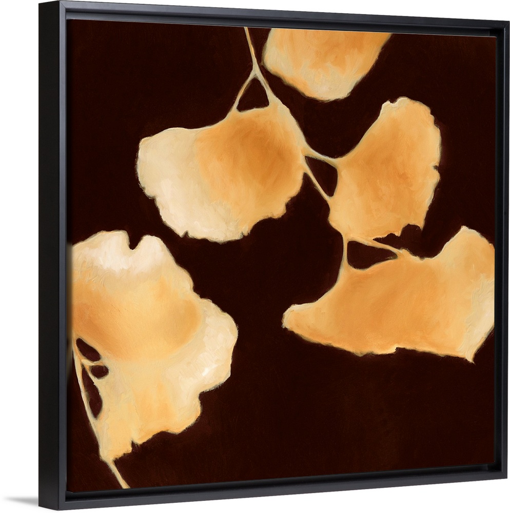 <p>Square, large artwork for a living room or office of two branches of leaves, one from the top and one from the bottom of the image, in golden tones on a dark background.</p>