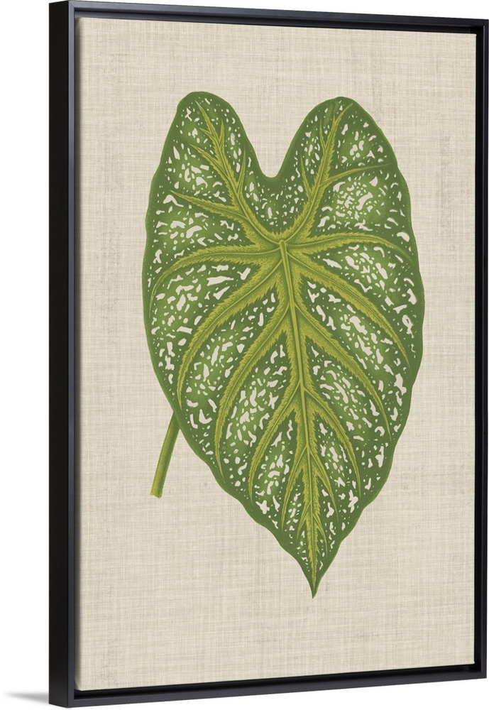 <p>This decorative artwork features an illustrative leaf with speckling detail over a neutral linen background.</p>
