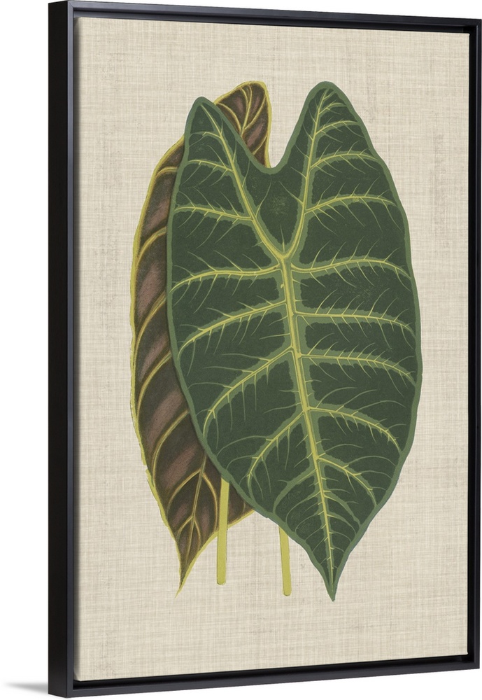 <p>This decorative artwork features an illustrated front and back view of a leaf with light green veins over a neutral linen background.</p>