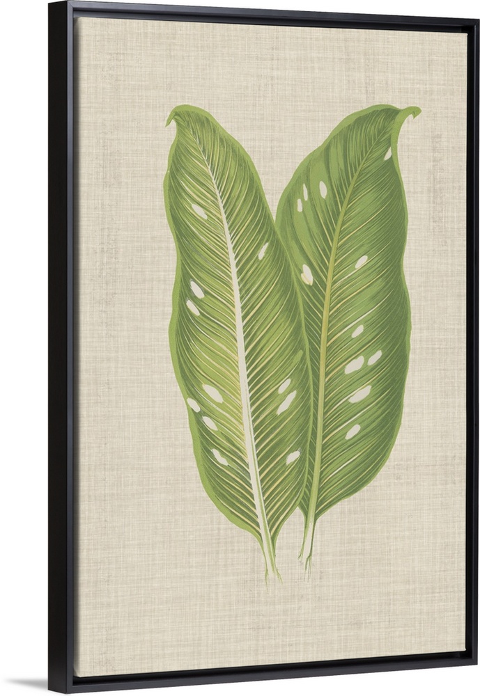 <p>This decorative artwork features an illustrated front and back view of a leaf with light green veins over a neutral linen background.</p>