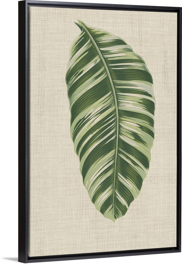 <p>This decorative artwork features an illustrative leaf with dark green stripes over a neutral linen background.</p>