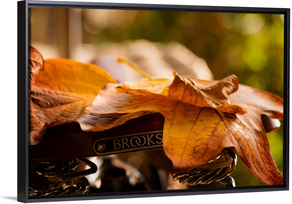 <p>Fine art photo of fallen autumn leaves lying on a bicycle seat.</p>