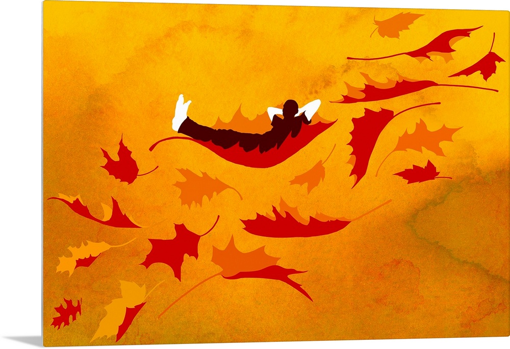 <p>Huge contemporary art shows a man lying on one leaf while surrounding leaves fall along side him.</p>