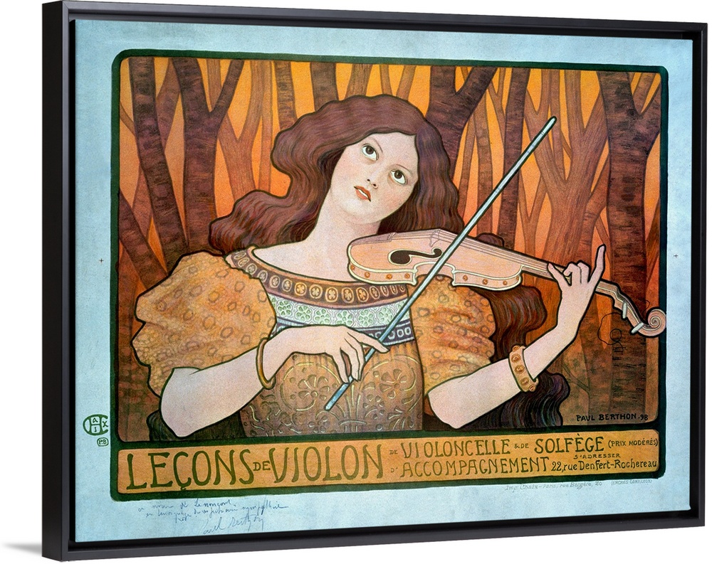 <p>This elegant Art Nouveau poster by Paul Berthon (1898) advertises violin, cello, and solfege lessons. It features a stylized woman with flowing hair playing the violin, set against a decorative forest backdrop in warm autumnal hues. Her expression is serene and introspective, embodying the idealized beauty and refinement associated with music and nature.</p>