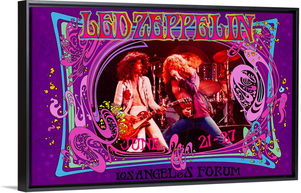 <p>Giant, landscape wall hanging of Robert Plant performing at the Los Angeles Forum, with the rest of Led Zeppelin, the image surrounded by bright, psychedelic artwork with the band name at the top.</p>