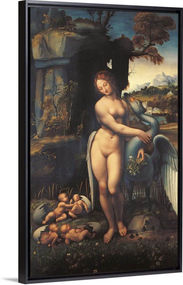 <p>Leda, by copy from Leonardo da Vinci, 1505 - 1507, 16th Century, - Italy, Tuscany, Florence, Uffizi Gallery. All. Young woman Leda body nude naked lily swan Jupiter love embrace hug eggs couples twins Castor Pollux harmony Helen Clytemnestra contention ro</p>