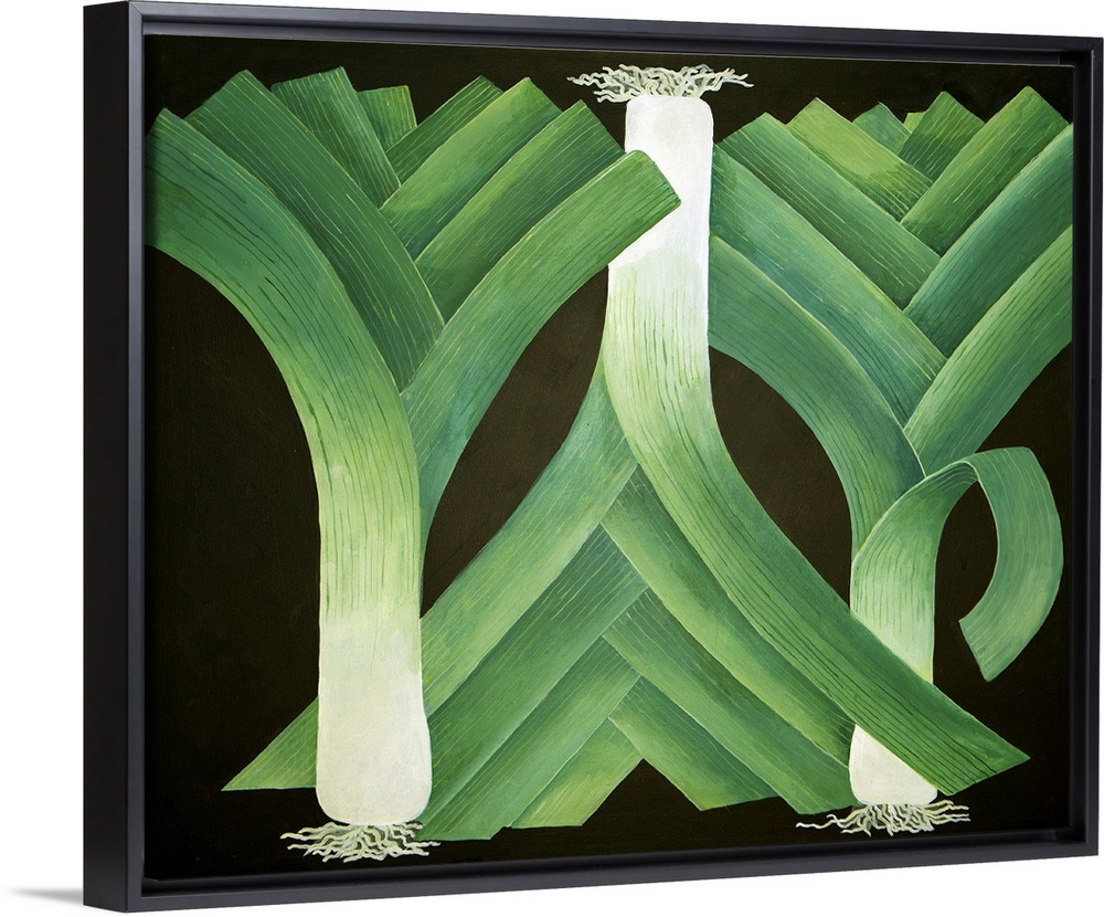 <p>Contemporary artwork of three leeks against a black background.</p>