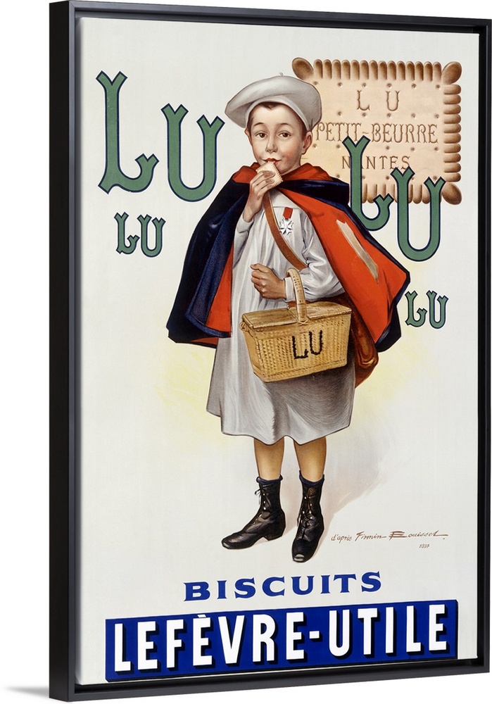 <p>Retro poster on canvas of a painting of a boy holding a basket eating a biscuit.</p>