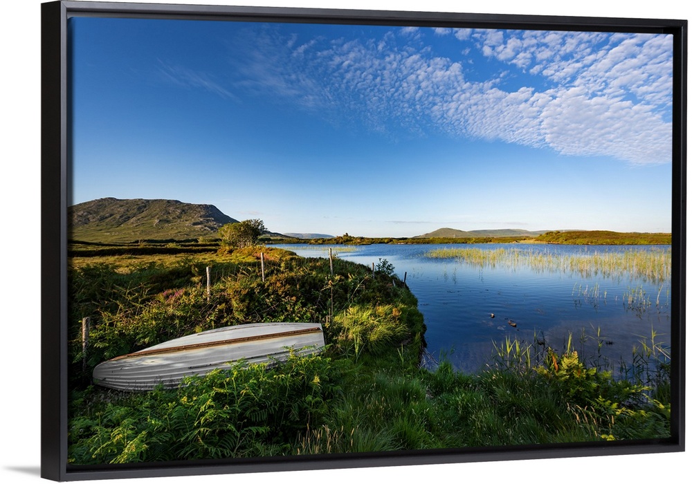 <p>Irish landscape of a lake with a boat in the foreground</p>