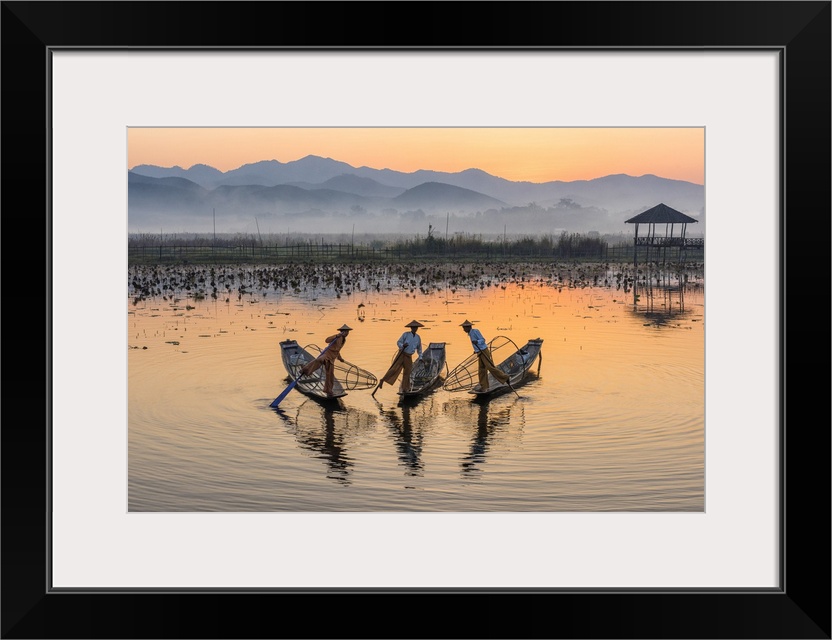 <p>Leg-rowing fishermen of Inle Lake at dawn, Shan State, Myanmar</p>