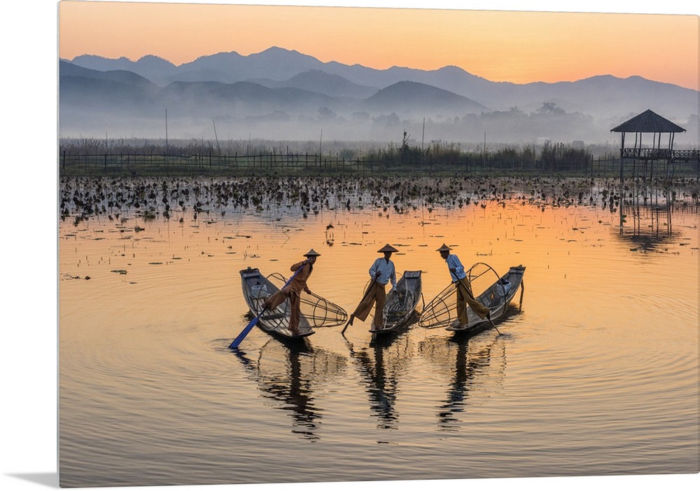 <p>Leg-rowing fishermen of Inle Lake at dawn, Shan State, Myanmar</p>