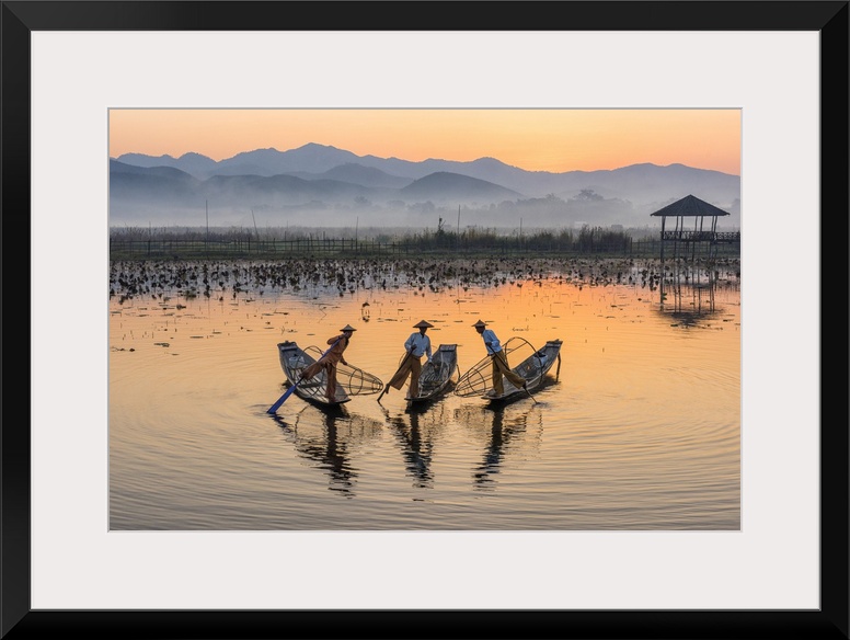 <p>Leg-rowing fishermen of Inle Lake at dawn, Shan State, Myanmar</p>
