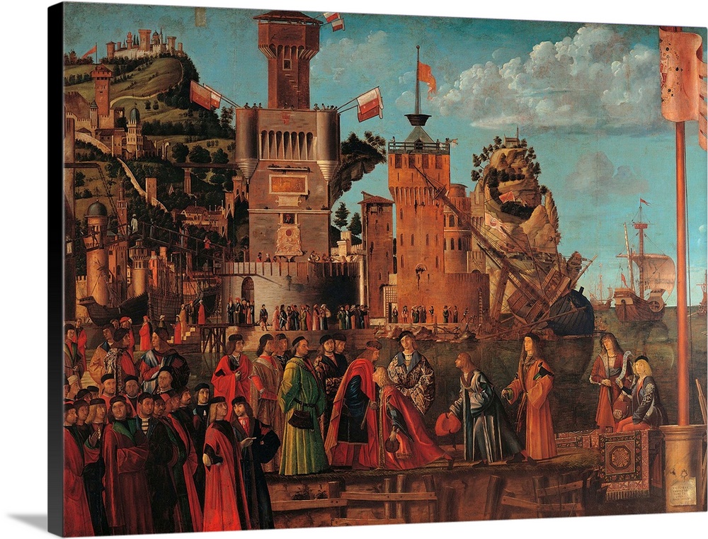 <p>Legend of St Ursula. Meeting and Departure of the Betrothed, by Vittore Carpaccio, 1495 about, 15th Century, oil on canvas, cm 279 x 610 - Italy, Veneto, Venice, Accademia Art Galleries, cat. 575. Detail. Figures onlookers bystanders crowd procession fare</p>