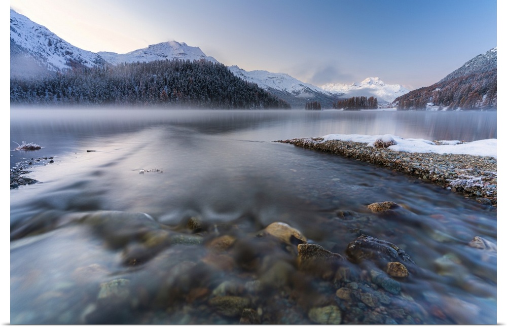 <p>Autumn sunrise on Lej Da Champfer with snow capped Piz Da La Margna and Piz Corvatsch in background, Engadine, canton of Graubunden, Switzerland, Europe</p>