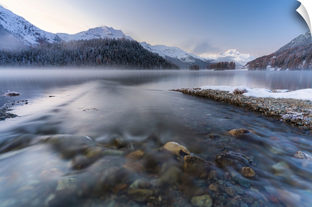 <p>Autumn sunrise on Lej Da Champfer with snow capped Piz Da La Margna and Piz Corvatsch in background, Engadine, canton of Graubunden, Switzerland, Europe</p>