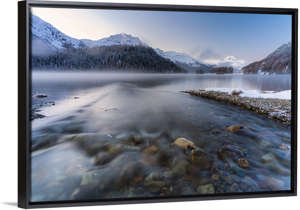 <p>Autumn sunrise on Lej Da Champfer with snow capped Piz Da La Margna and Piz Corvatsch in background, Engadine, canton of Graubunden, Switzerland, Europe</p>