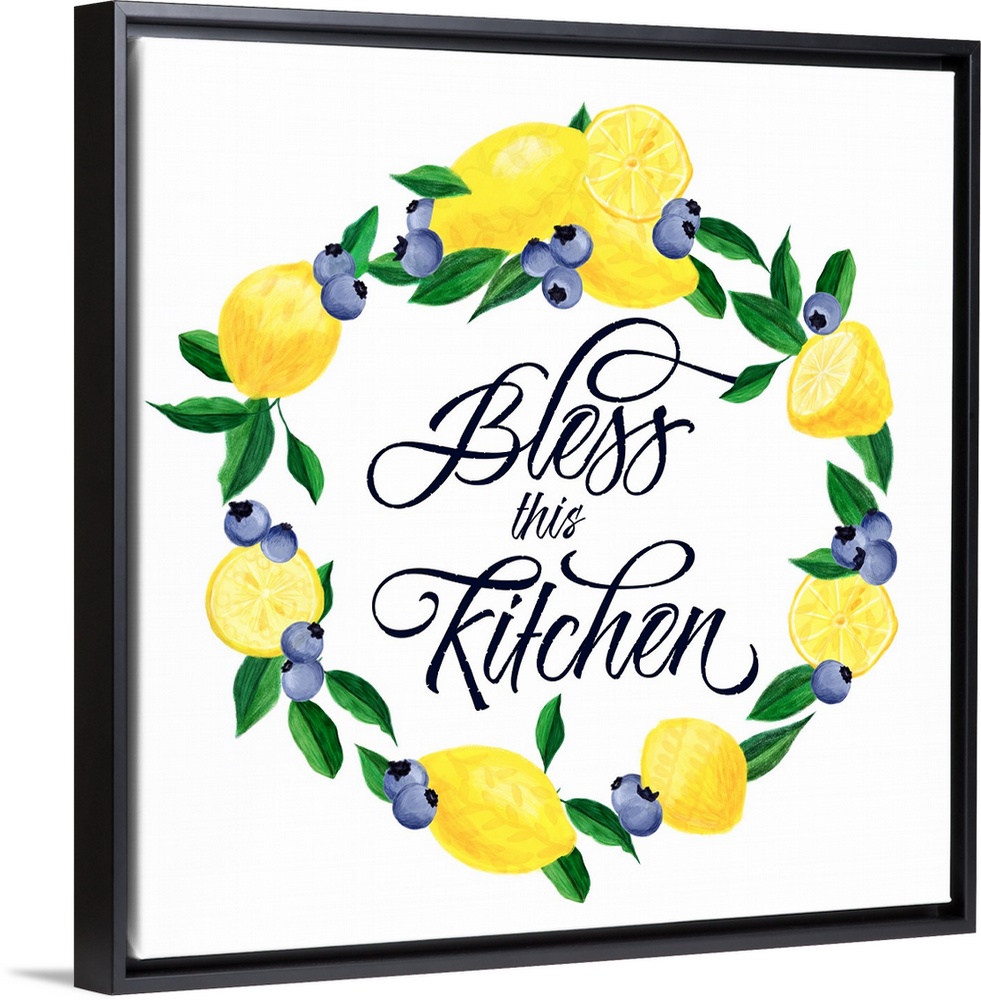 <p>"Bless This Kitchen" in the middle of a wreath made of lemons and blueberries.</p>