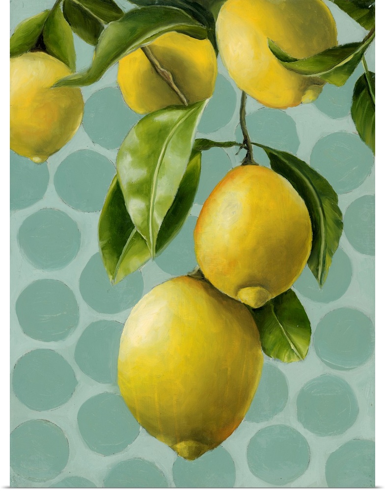 <p>Vibrant painting of yellow lemons and green leaves against a whimsical teal polka-dot background, exuding fresh, cheerful charm.</p>