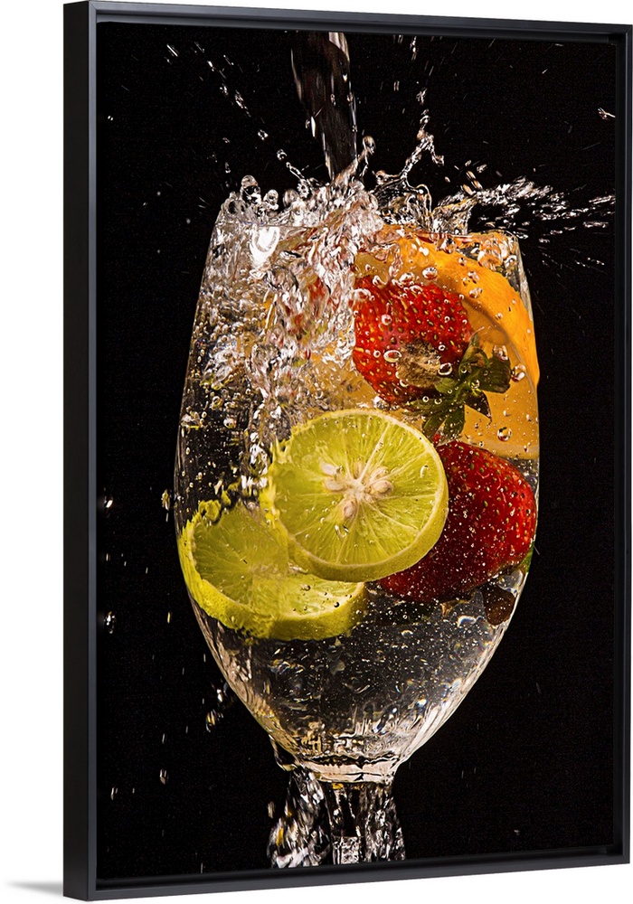 <p>Slices of lemons and oranges and whole strawberries splashing into a glass of water.</p>