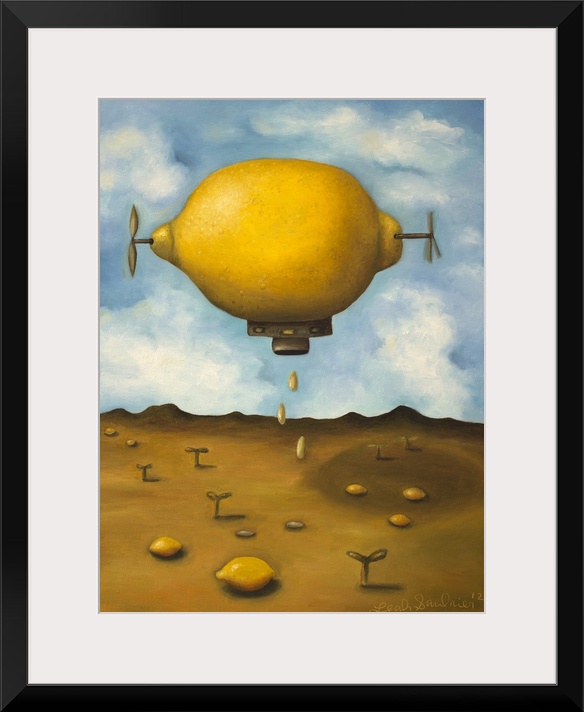 <p>Surrealist painting of a lemon zeppelin above a desert landscape.</p>