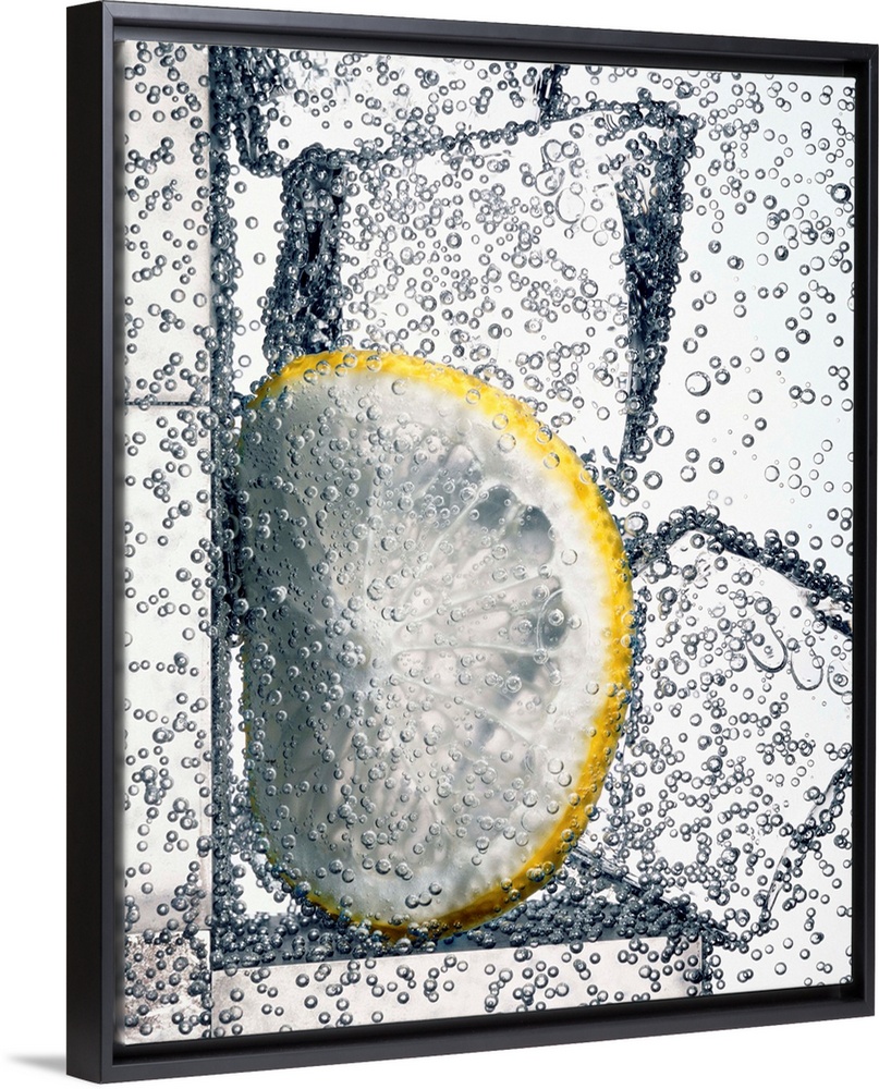 <p>Lemonade. Bubbles rise from this carbonated water drink which has ice cubes and a slice of lemon added.</p>