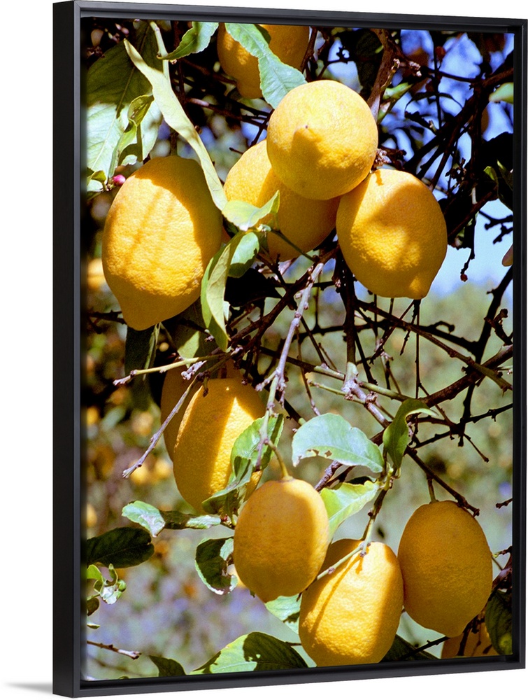 <p>Lemons (Citrus limon) on the branch of a tree. Lemons are a good source of vitamin C.</p>