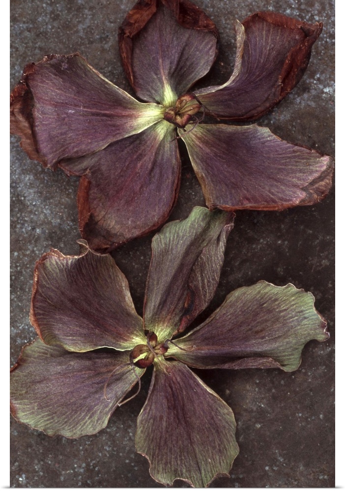 <p>Two purple dried flowers of Lenten rose or Helleborus orientalis lying on tarnished metal</p>