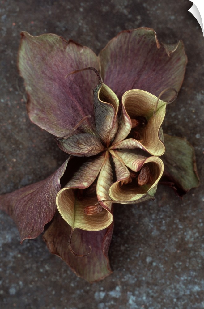<p>Purple dried flower of Lenten rose or Helleborus orientalis with bursting seedpods lying on tarnished metal</p>