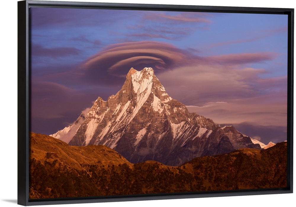 <p>Lenticular clouds at sunset above Machapuchare, Himalayas, Nepal.</p>