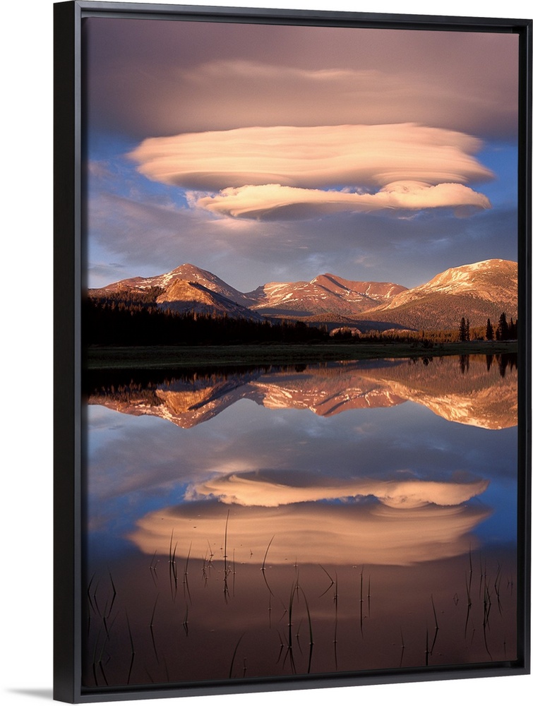 <p>Tall canvas photo art of billowing clouds above rolling hills reflected in the water.</p>