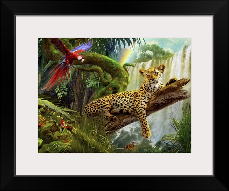 <p>Whimsy illustration of a leopard on a log in the jungle with a waterfall in the background and a parrot flying to the side.</p>