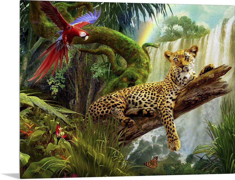 <p>Whimsy illustration of a leopard on a log in the jungle with a waterfall in the background and a parrot flying to the side.</p>