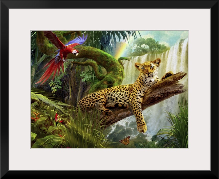 <p>Whimsy illustration of a leopard on a log in the jungle with a waterfall in the background and a parrot flying to the side.</p>