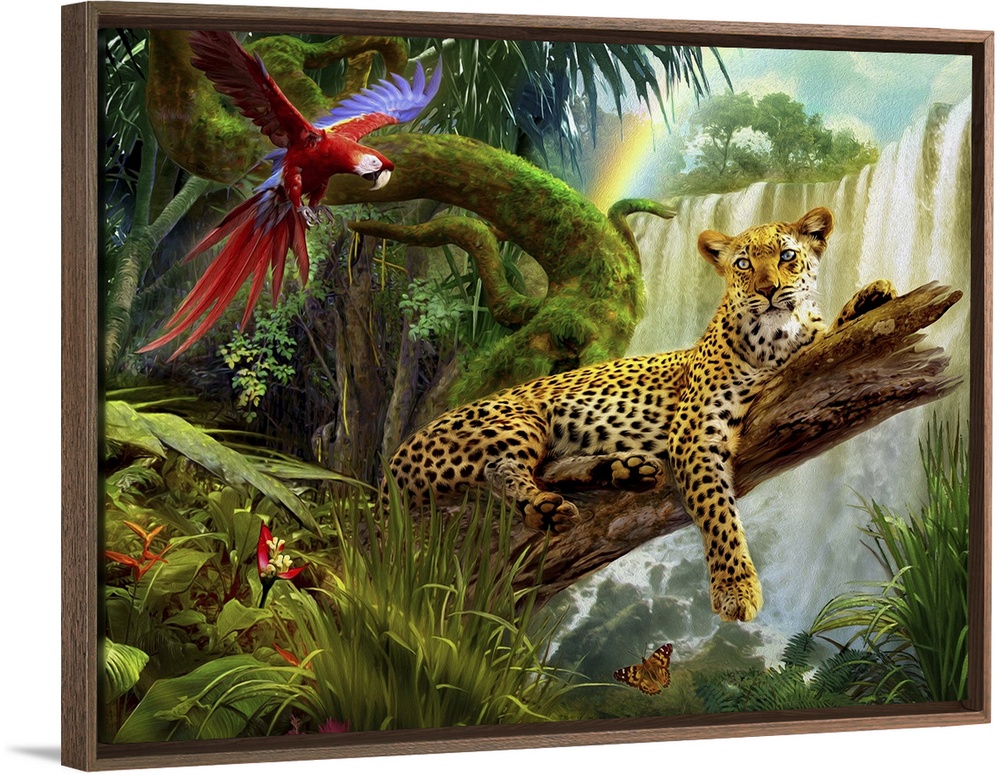<p>Whimsy illustration of a leopard on a log in the jungle with a waterfall in the background and a parrot flying to the side.</p>
