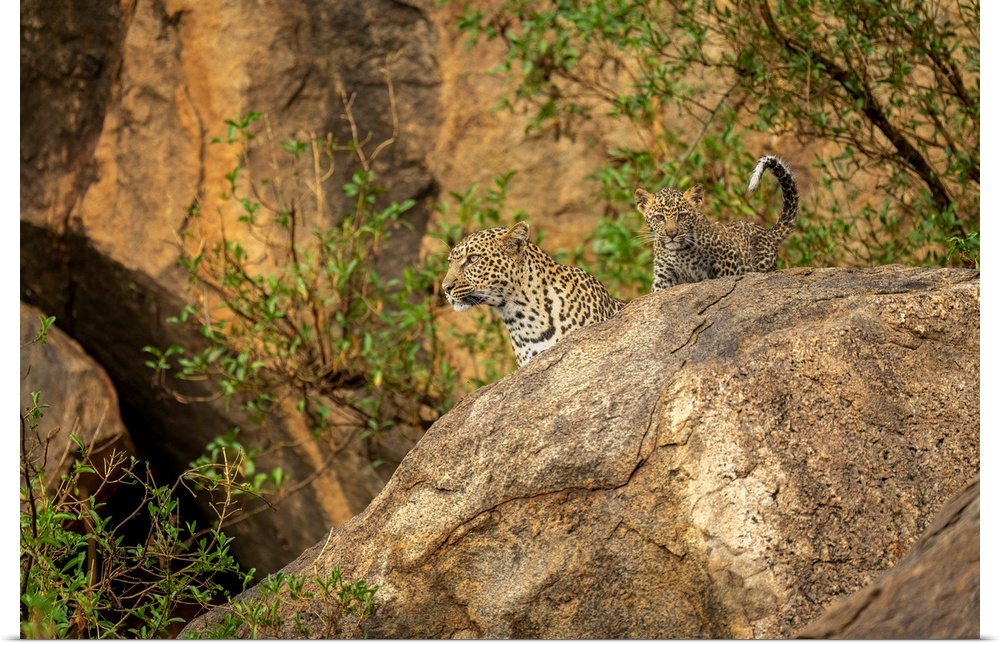 <p>Leopard and cub (Panthera pardus) look out from rock; Kenya</p>
